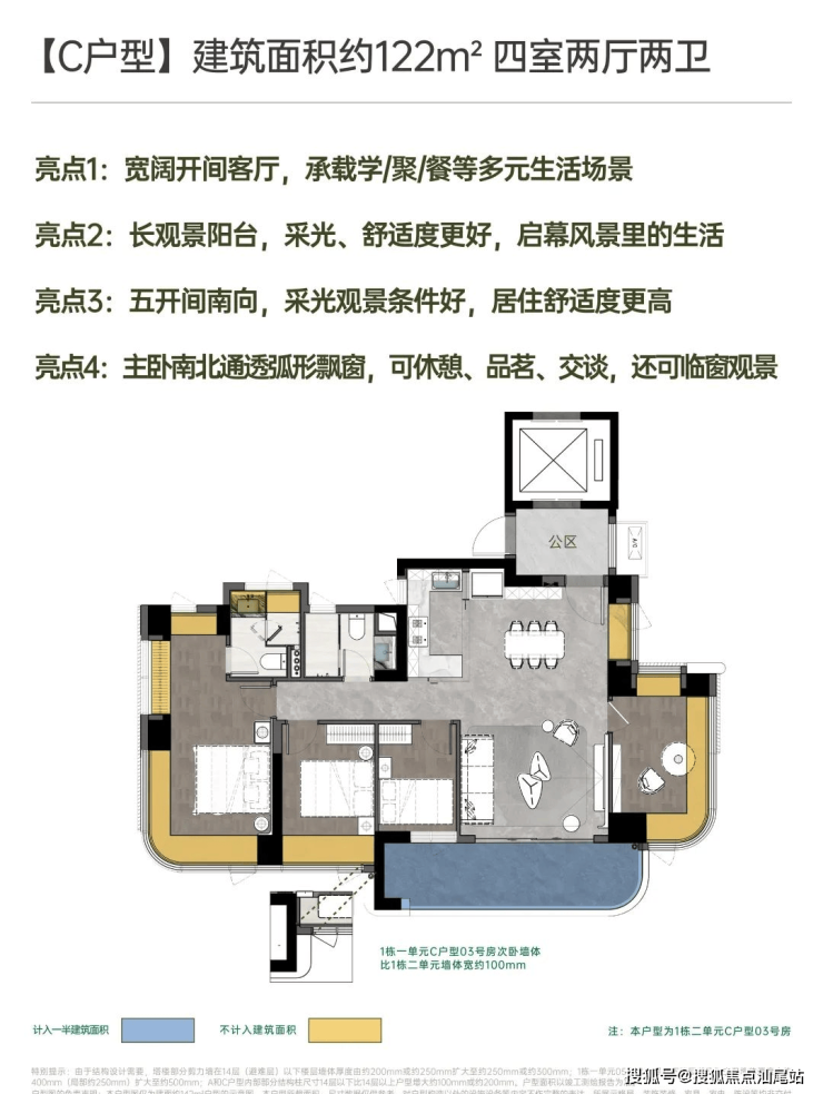 项目共规划主力为3-4房产品:建面约142㎡南北方厅 阔景四房;