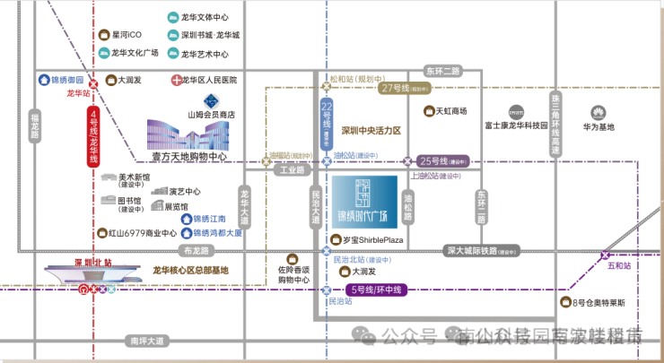 道路交通:楼下工业路速达龙华中心区,油松路接布龙路速达全城各区,项目车行约19分钟快速接驳深圳北站、约25分钟直通福田,便捷交通速达全城;