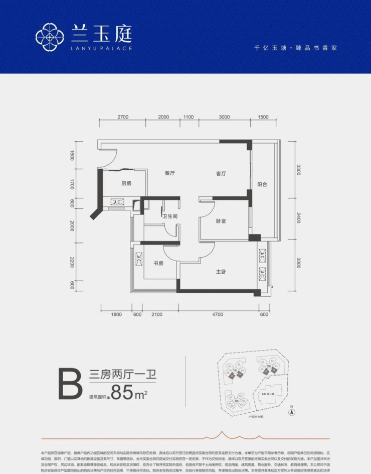 85㎡的3房2厅1卫,B户型,设计的是竖厅格局,客厅开间3.3米,LDKB一体化,三开间朝南,3个卧室分别做到了3米/2.7米/2.4米的宽度,客厅连接次卧出5.7米长的大阳台,L型厨房,创新式三分离卫生间,得房率约79%(不含赠送),西南或东南朝向。