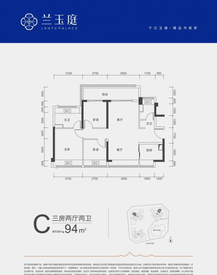 94㎡的3房2厅2卫,C户型,设计的是竖厅南北通透格局,客厅开间3.5米,3个卧室分别做到了3.1米/2.7米/2.7米的宽度,客厅连接次卧出6.2米长的大阳台,U型厨房,公卫三段式分离,得房率约79%(不含赠送),阳台主朝西北或东北向。