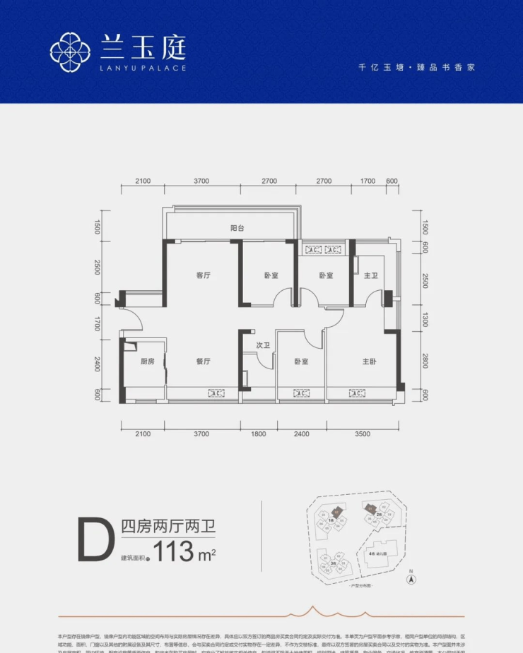 113㎡的4房2厅2卫,D户型,设计的是竖厅南北通透格局,客厅开间3.7米,4个卧室分别做到了3.5米/2.7米/2.7米/2.4米的宽度,客厅连接次卧出6.4米长的大阳台,U型厨房,公卫三段式分离,得房率约79%(不含赠送),阳台主朝西北或东北向。