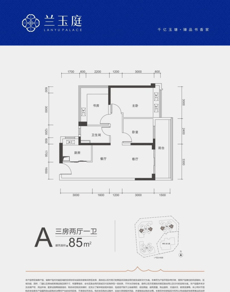 85㎡的3房2厅1卫,A户型,设计的是竖厅格局,客厅开间3.3米,LDKB一体化,三开间朝南,3个卧室分别做到了3米/2.8米/2.4米的宽度,客厅连接次卧出5.7米长的大阳台,L型厨房,得房率约79%(不含赠送),西南或东南朝向。