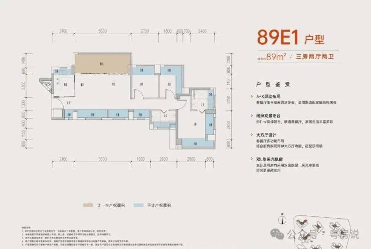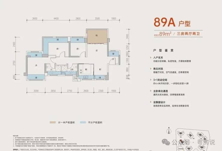 89㎡的3房2厅2卫,B户型,设计的是经典竖厅格局,进门入户玄关,客厅3.5米开间,三开间朝南,,主卧+1个次卧270°飘窗,3个卧室分别做到了主卧15.1㎡/次卧8.52㎡/次卧7.77㎡(包含墙体飘窗),得房率约:77.39%(不含赠送),西南朝向。赠送面积16.96㎡,加上赠送得房率96.84%。