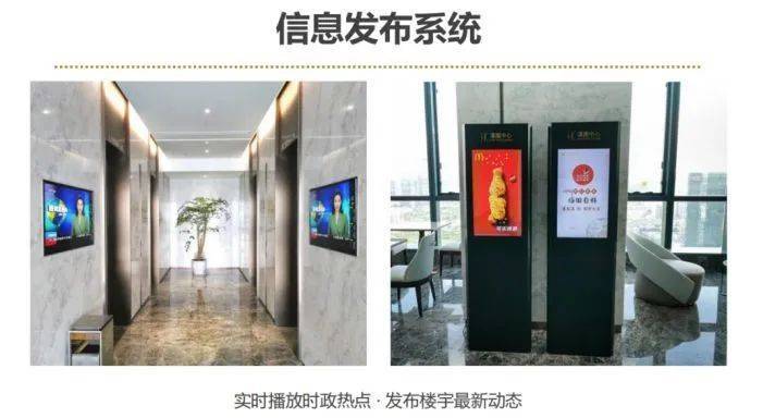 遍布全楼(电梯轿厢、电梯前室、会议室门口、裙楼走廊、外立面)的信息发布终端可以实时发布各种资讯及滚动播出商家广告。