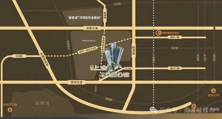 项目占位深圳最高水平金融总部聚集区、国家级南方金融中心的香蜜湖金融中心南区。⾹梅路南延线&福华⼀路延⻓线贯通双⾦融中⼼,项⽬位于⾹蜜湖⾦融街1公⾥半径⽣活圈内。