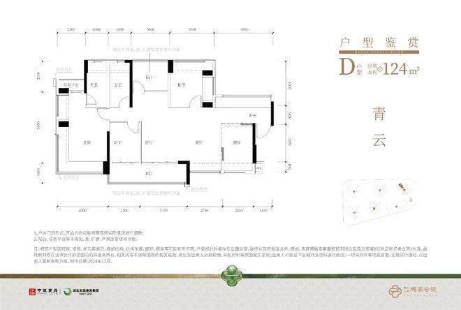 124㎡的4房2厅2卫,设计的是横厅南北通透格局,进门入户玄关,客餐厅6.35米开间,4个卧室分别做到了主卧20.95㎡/次卧10.58㎡/次卧9.45㎡/次卧7.2㎡(包含墙体飘窗),主卧+1个次卧270°飘窗,另有1个收纳间3.43㎡,客厅连接次卧出6.3米长大阳台,L型厨房,得房率约103.7%(包含赠送),阳台主朝西南或东南向。
