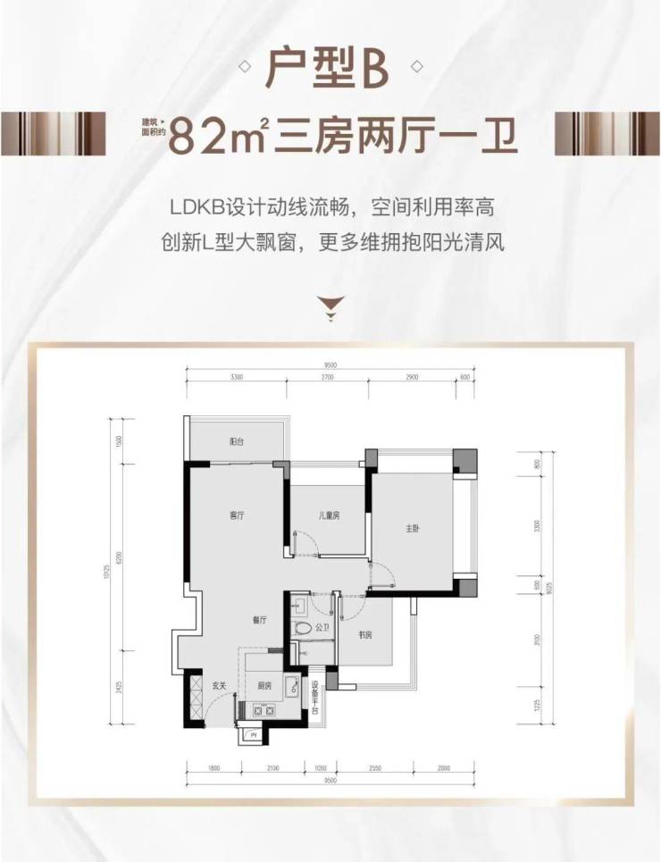 82㎡的3房2厅1卫(户型B),设计的是经典竖厅格局,进门入户玄关,客厅3.3米开间,LDKB一体化设计,动静分区,3个卧室分别做到了3.5米/2.7米/2.55米的宽度,主卧加1个次卧270°飘窗设计,U型厨房,得房率:77.5%(不含赠送),全部东北朝向。