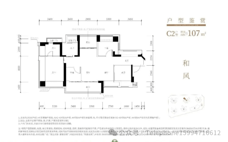 107㎡的4房2厅2卫,设计的是横厅南北通透格局,进门赠送约4㎡入户玄关,客餐厅6米开间,4个卧室分别做到了主卧18.56㎡/次卧9.01㎡/次卧8.99㎡/次卧6㎡(包含墙体飘窗),主卧+1个次卧270°飘窗,客厅连接次卧出5.7米长大阳台,U型厨房,得房率约102.5%(包含赠送),阳台主朝西南向。