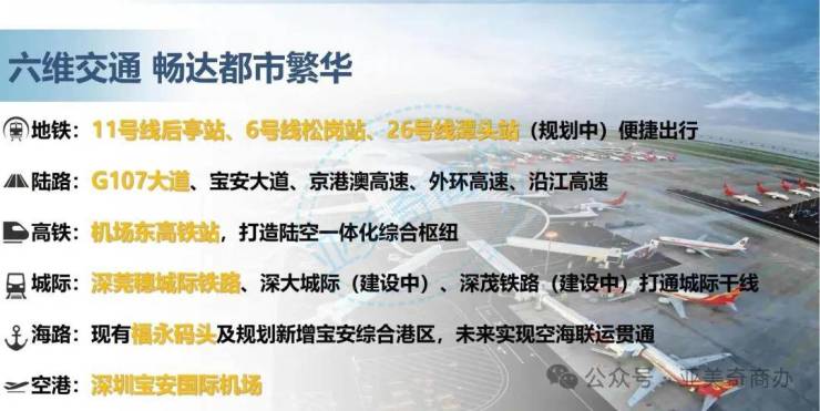 这里交通极为便利,临近 11 号线后亭站、6 号线松岗站,规划中的 26 号线潭头站也将带来更多便捷。周边环绕 G107 大道、宝安大道等干线,机场东高铁站在建,还有深莞穗城际等规划线路,福永码头及规划的宝安综合港区,加上宝安国际机场,构建起六维立体交通。