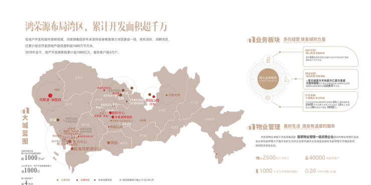 鸿荣源,城市地标缔造者,与城市共荣,汇集鸿荣源32年匠心精铸,传承“誉”系精工品质,携超能标杆钜作,献礼湾区,鸿荣源32年稳健发展、布局大湾区,累计综合开发建筑面积超过1000万㎡。