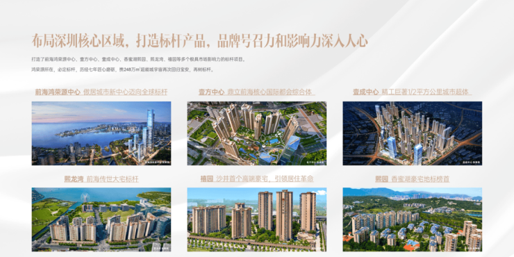 2015年至今,地产开发销售额累计逾1000亿,累计服务客户逾4万户,打造了前海鸿荣源中心、壹方玖誉、壹成中心、香蜜湖熙园等标杆项目。