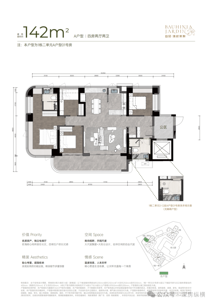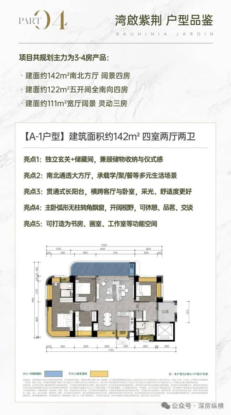 建面约142㎡南北方厅 阔景四房;