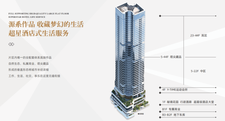 项目位于深圳深南大道与文锦路的交汇处,建面约8.12万㎡,地下3层,地上44层,融合了星级俱乐部、塔尖藏品、商业、休闲、生态等业态,提供建面约60-108㎡法拉利总裁空间和建面约227-249㎡高定大平层,共324席。