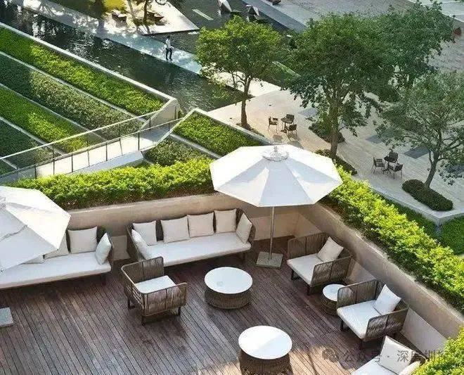 围合式庭院布局最大化构建着生态园林,采用密集的多层次花园种植,营造宁谧安静的休闲空间,辅以地形和水景的设计营造充满艺术感的休息环境。