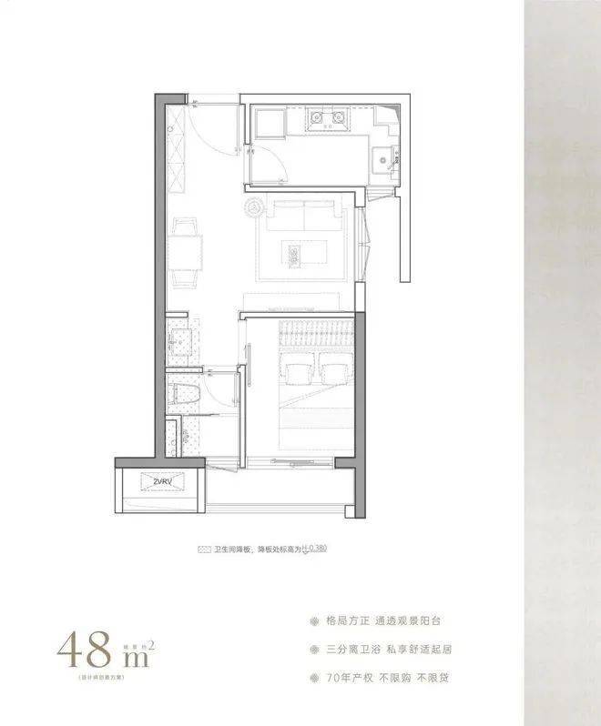 建面约45-48㎡,格局方正,功能齐备带阳台,卫生间三分离设计;且经专业人士评判,该户型可以改造为两房,在寸土寸金的福田实现面积利用最大化,预计未来租金可达6800-7000元/月。
