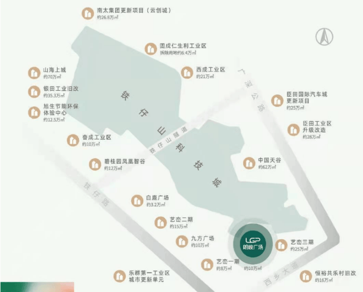 周边布局的更新改造项目较多,多为“工改工”项目,这一片已被定位为铁仔山科技城,近1-2年内,就有碧桂园凤凰智谷、中国天谷及阳基九方广场等产业项目入市。