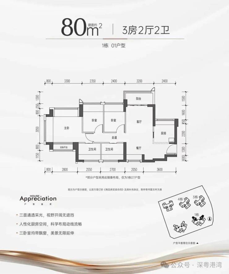 80㎡是本批次产品中唯一设计为南北对流格局,而且是整体横向采光,位于1栋,仅有2条腿,朝向社区内部园林相对静谧。