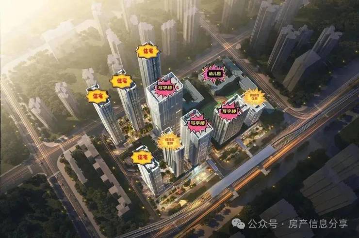 根据公示规划,项目由4栋45F超高层住宅、3栋40F、30F写字楼、1栋45F保障房、1栋3F幼儿园以及一所九年制学校组成,未来将建设成为集住宅、办公商业为一体近40万㎡的TOD城市商住综合体项目。