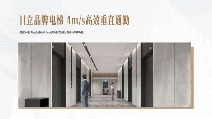 5+1台日立品牌电梯,4m/s高效垂直通勤!满足大规模人流同行,助力企业高效办公