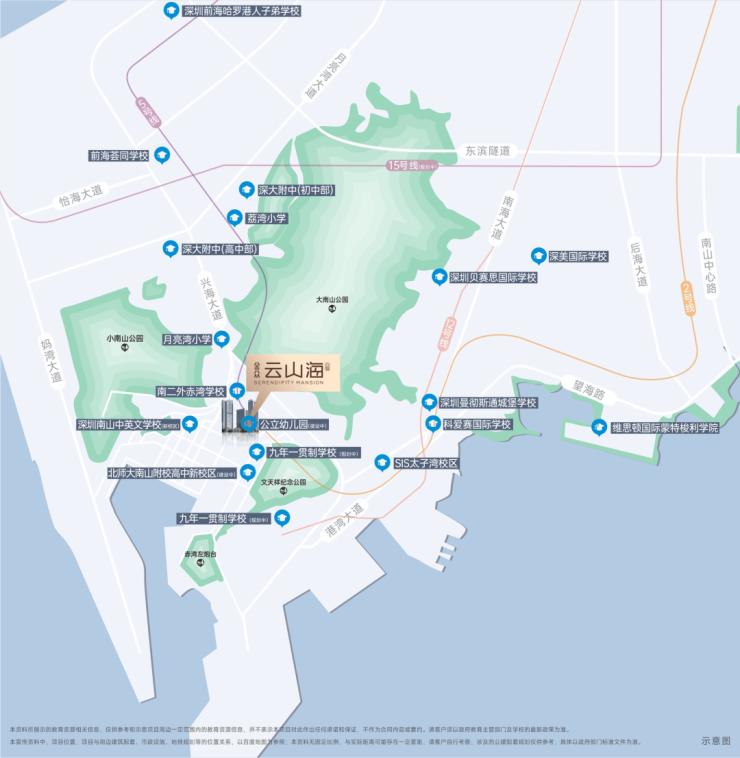 🔘周边教育信息介绍:社区自带双18班幼儿园(建设中)、直线距离约280米公办九年一贯制南二外赤湾学校、深大附中高中部、北师大南山附校高中新校区(即市第三十高级中学,建设中)、两所九年一贯制学校(规划中)