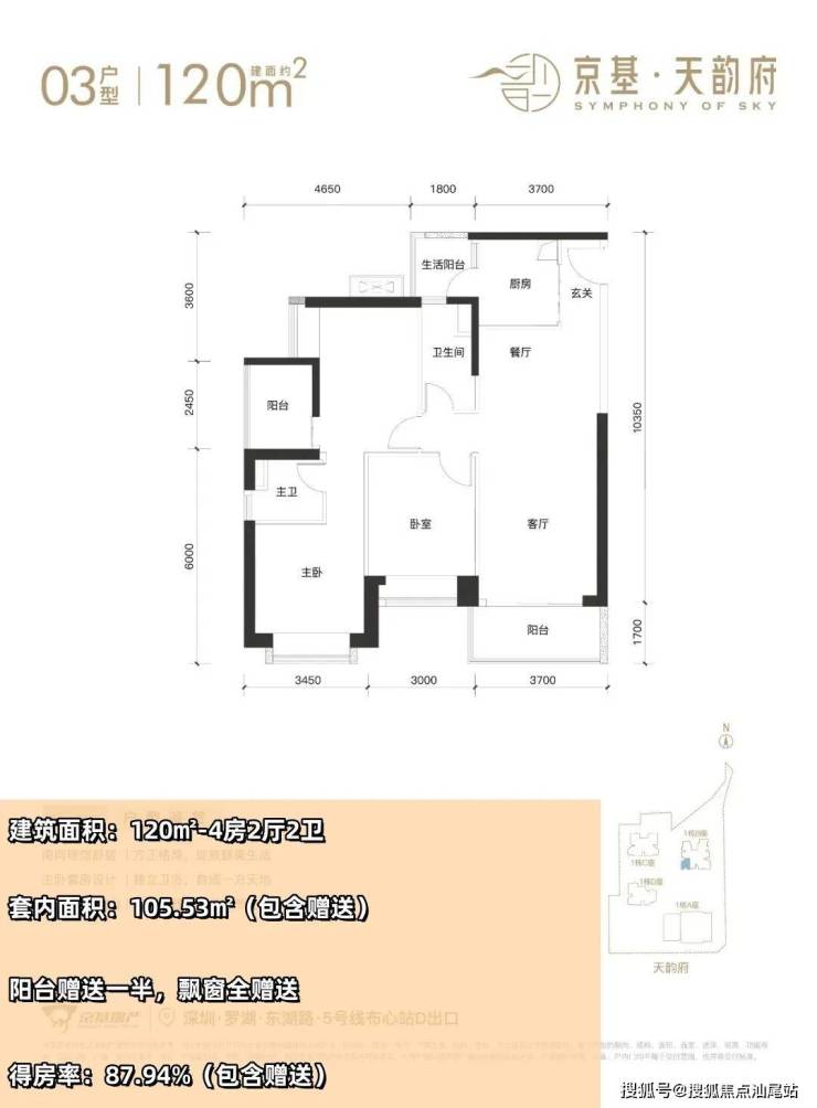 120㎡的4房2厅2卫,设计的是竖厅格局,动静分区,LDKB一体化设计,客厅3.7米开间,三开间朝南,厨房还带一个生活阳台,得房率87.94%(包含赠送),阳台进深1.7米,正南朝向。