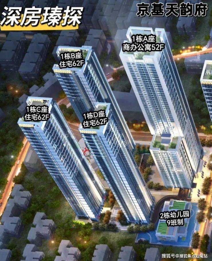京基天韵府,总占地面积约1.95万㎡,总建筑面积约24.6万㎡,计容建筑面积约20万㎡,容积率10.26,绿化率36%,共由3栋62F的超高层住宅+1栋商办公寓组成,其中1栋A座商办公寓52F,1栋B/C/D座住宅62F,2栋是1所9班制幼儿园。