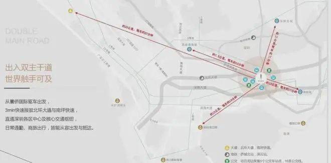 快捷交通路网,北环大道/南坪快速/侨香路/京港澳高速,20-30分钟到福田CBD、深圳北站、皇岗/福田/深圳湾三大口岸、宝安机场等,城芯而居,超享生活。