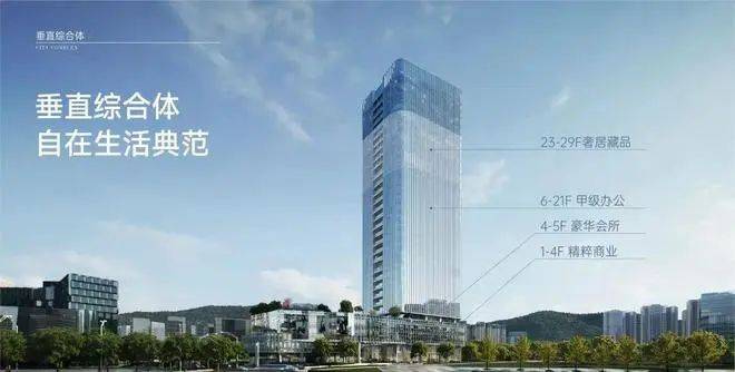集合云端居住、奢雅会所、精粹商业、甲级办公为一体的垂直综合体,生活&休闲、社交&事业,悦然相逢,自在切换。