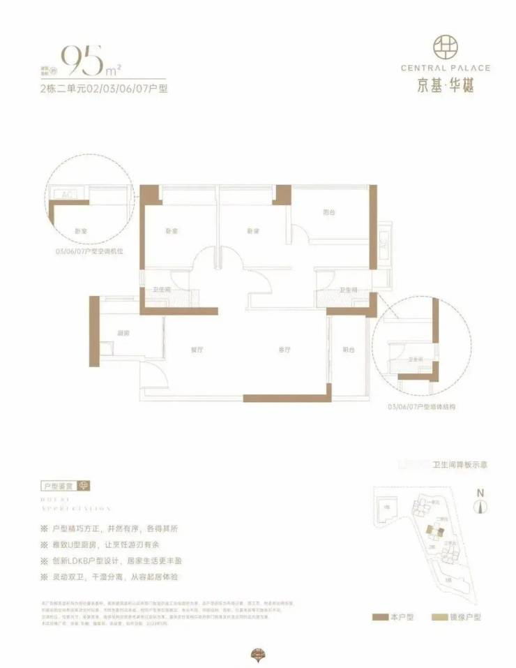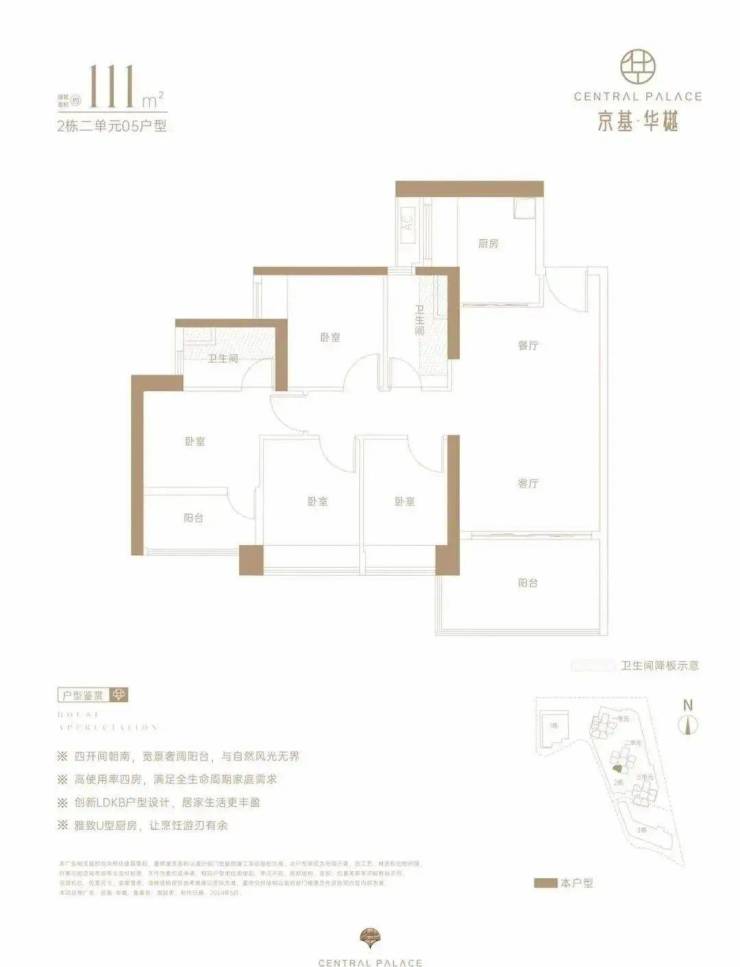 仅2栋2单元05户型才有,设计的是经典竖厅格局,LDKB一体化,动静分区,四开间朝南,U型厨房,卫生间干湿分离,得房率约73%(不含赠送),阳台西南朝向。