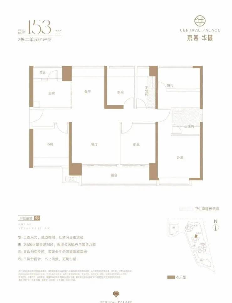 项目户型包括95㎡的3房2厅2卫、99㎡的3房2厅2卫、111㎡的3房2厅2卫、120㎡的3房2厅2卫、143㎡的4房2厅2卫及153㎡的5房2厅2卫,143㎡四房为横厅设计。