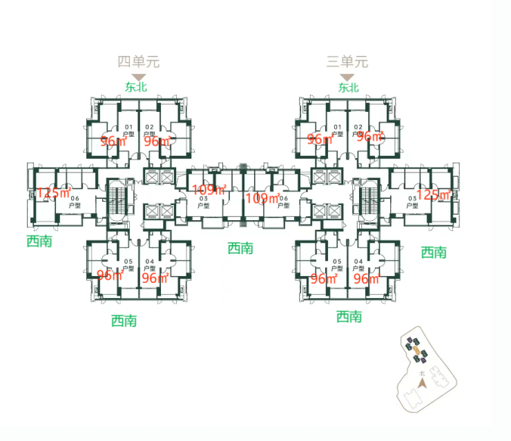 推出约560套,面积96-109-125㎡,整体户型西南向(03/04/05/06),部分东北(01、02户型)