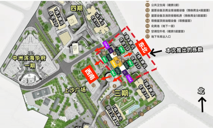 从朝向来看, 西南面可以直面一线海景,阳台视野卡在「中洲滨海华府一期」和「中洲湾迎海」之间,基本无遮挡,6楼以上可看到海景,低楼层看花园、下沉广场以及公园。