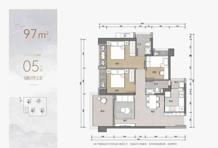 3房为97平3房2卫的户型