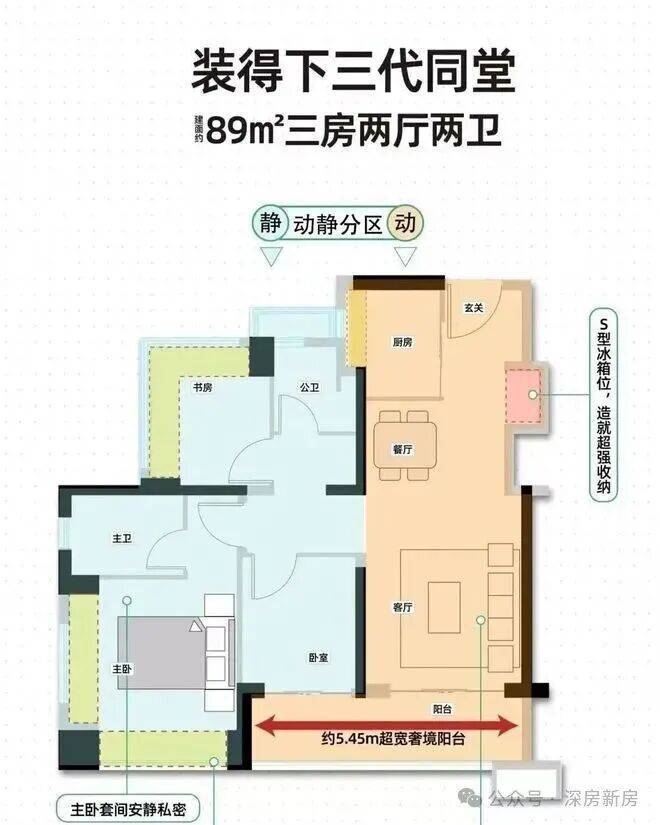 89㎡的3房2厅2卫,02.03户型,设计的是经典竖厅格局,客厅3.4米开间,LDKB一体化,S墙设计预留冰箱卡槽位,动静分区,三开间朝南,3个卧室分别做到了主卧13.79㎡/次卧7.62㎡/次卧6.93㎡(包含墙体飘窗),主卧+1个次卧270°飘窗设计,U型厨房,公卫三段式分离,客厅连接卧室出5.75米长的大阳台,得房率约87.2%(包含赠送),东南朝向。