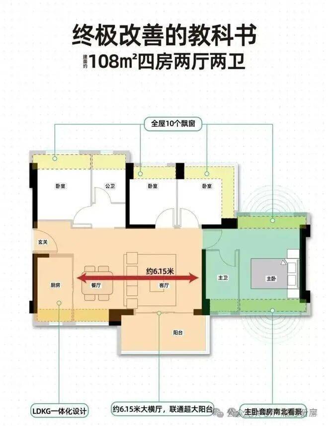 108㎡的4房2厅2卫,设计的是横厅南北通透格局,进门独立玄关,客餐厅6.4米开间,LDKB一体化,五开间朝南,主卧双飘窗通透设计,全屋10个凸窗,4个卧室分别做到了主卧17.01㎡/次卧9.7㎡/次卧8.4㎡/次卧7.35㎡(包含墙体飘窗),L型厨房,卫生间干湿分离,得房率约91.88%(包含赠送),阳台主朝西南或东南向。