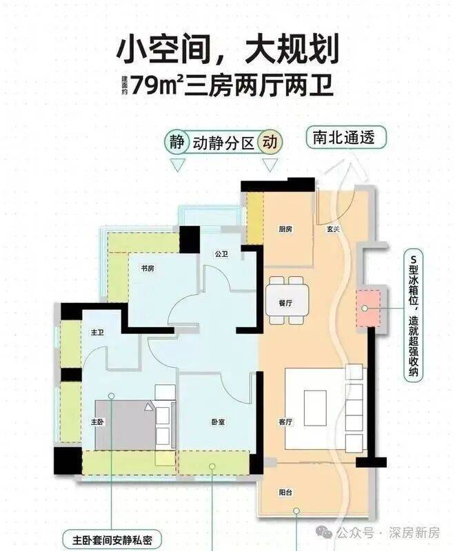 79㎡的3房2厅2卫,设计的是经典竖厅格局,客厅3.3米开间,LDKB一体化,S墙设计预留冰箱卡槽位,动静分区,三开间朝南,3个卧室分别做到了主卧12.1㎡/次卧7.36㎡/次卧6.67㎡(包含墙体飘窗),主卧+1个次卧270°飘窗设计,U型厨房,公卫三段式分离,得房率约88%(包含赠送),东南或西南朝向。