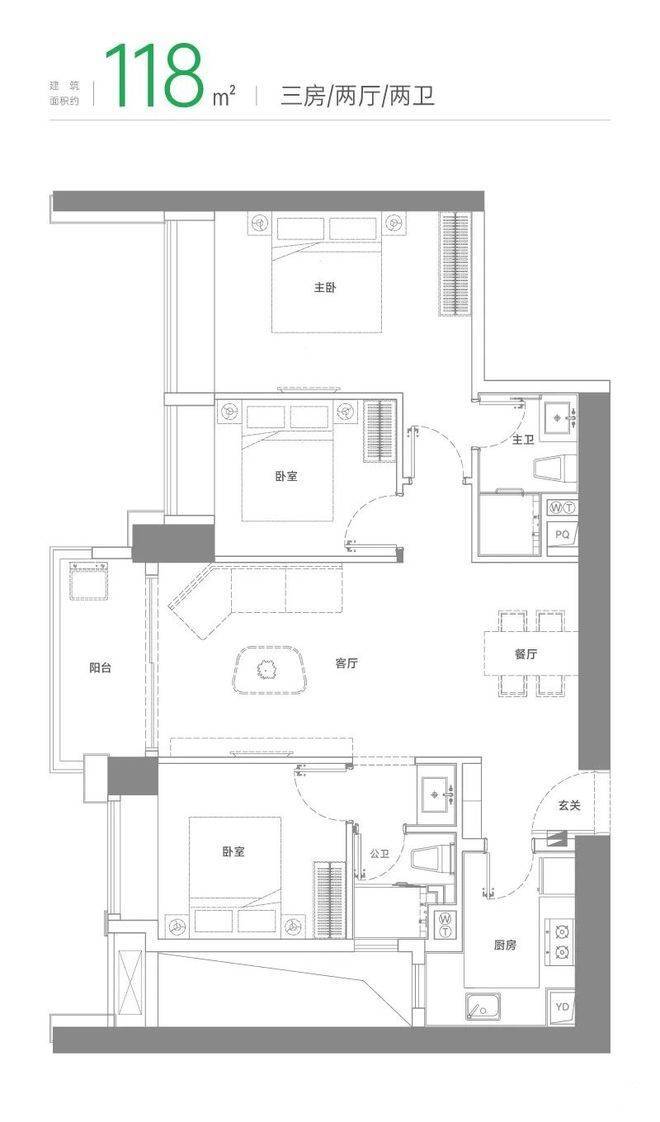 【建面约118 ㎡ 三 房 两 卫】