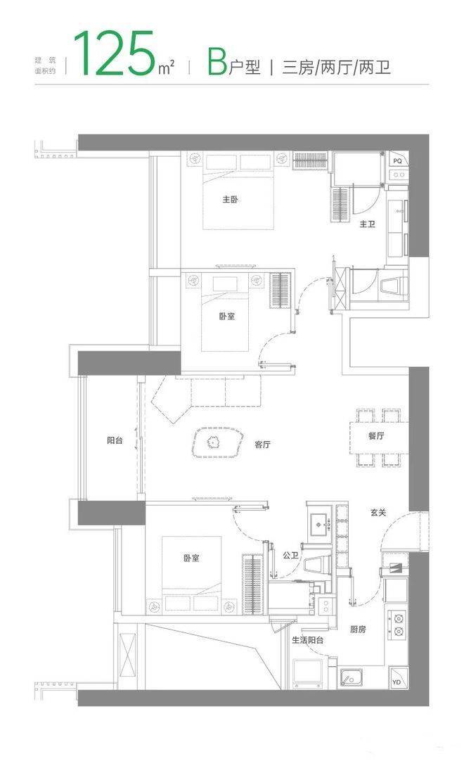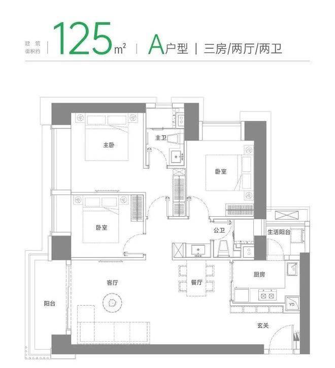 约125㎡A为经典的三房两厅两卫竖厅设计,户型货量最多有646套,分为东南、西南等朝向;双阳台,厨房连通生活阳台,整体动静分区。