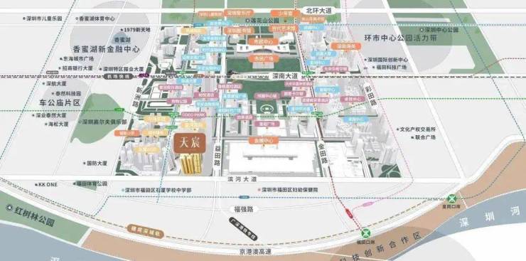 【项目地址】项目位于福田中心的核心位置,东边是会展中心,东北面能看见平安金融中心大楼,西侧是发展兴苑东区,南邻滨河大道,北临星河国际。