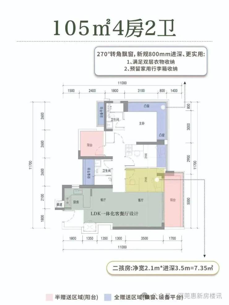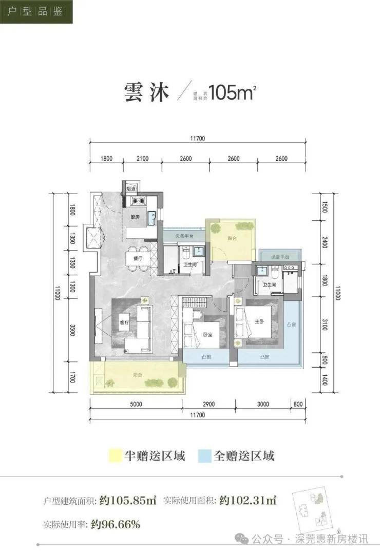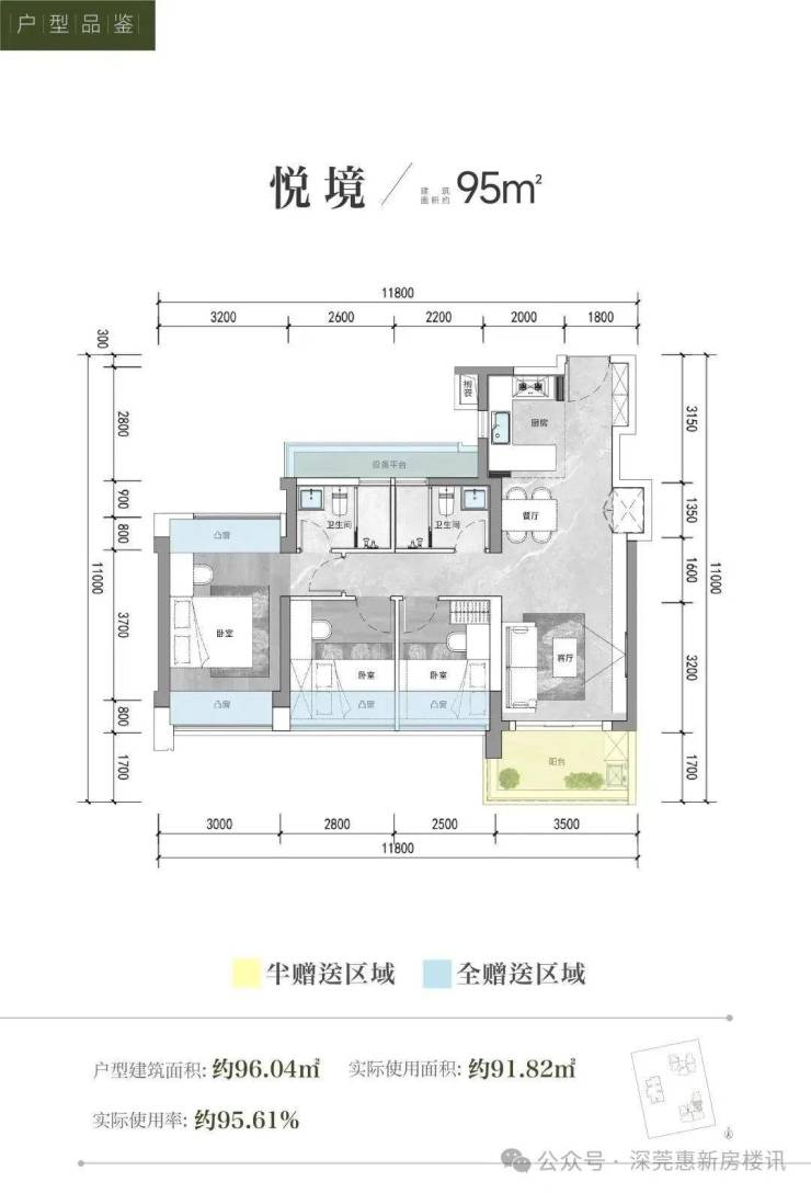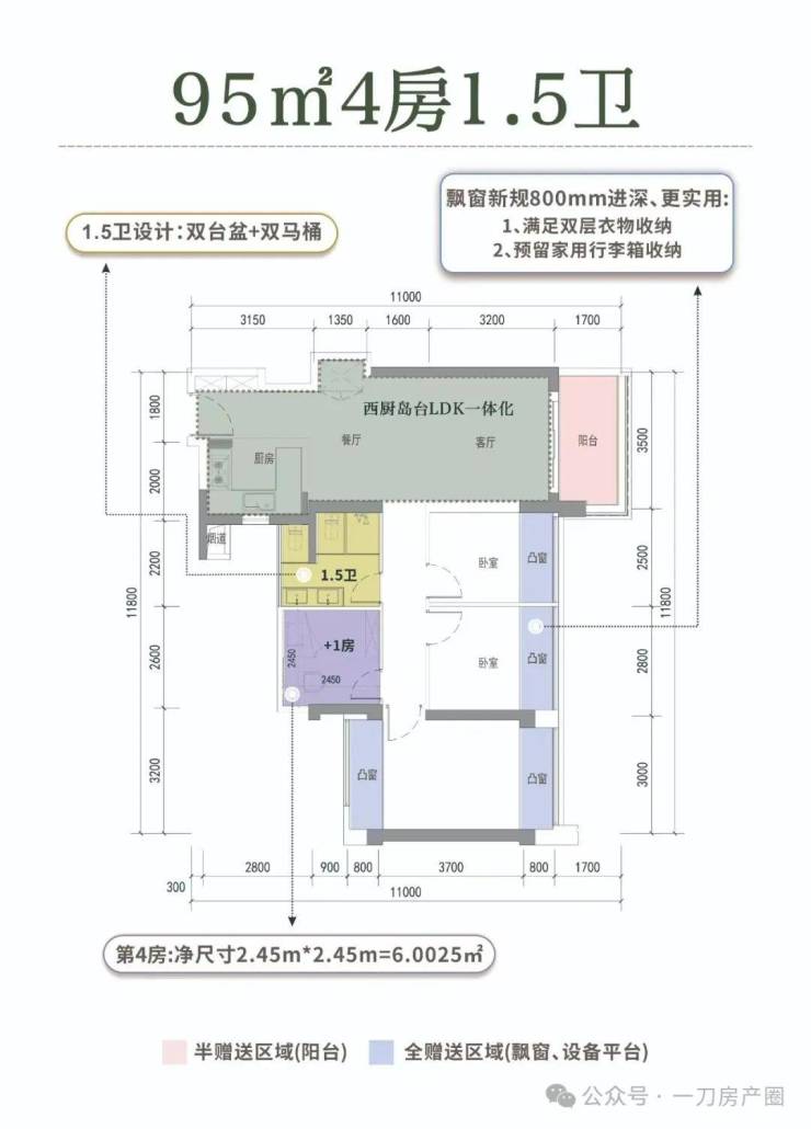 产品属于新规设计,据说综合得房率达到95%左右,其中最亮眼的是95平做到4房+1.5卫,105平做到4房2卫。