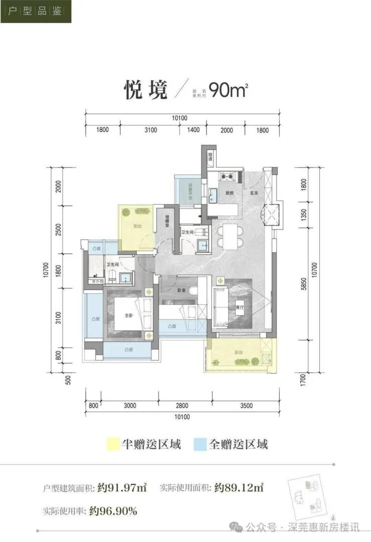 首先看看90㎡的3房两卫,使用率含赠送约96.9%,传统竖厅格局,有个次卧需要阳台改房间,主卧双面飘窗采光,其中一面可以用来做衣柜。