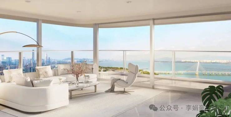 项目采用270°环幕落地窗设计,客厅转角无柱,室内层高达到3.3-3.6米,能将窗外海景形成巨幕级别的景观体验。作为深圳首个采用“铸铝”打造外立面的项目,窗墙比达到了惊人的1:7。