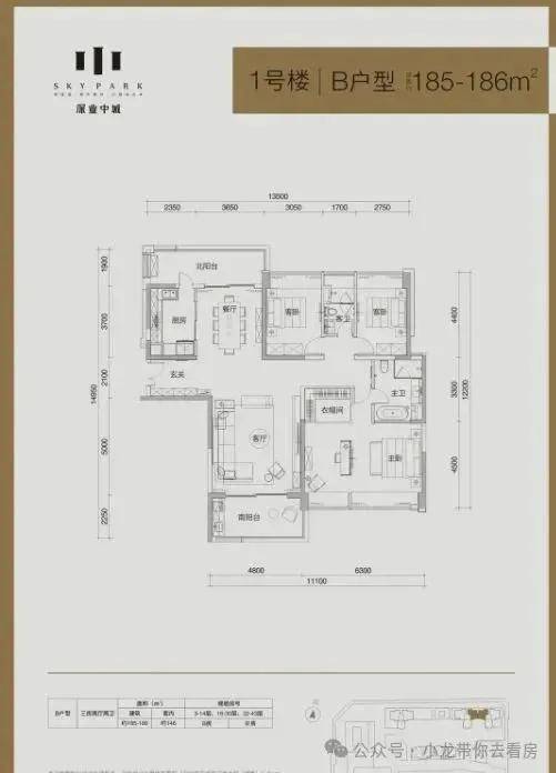 B户型:185-186㎡3房2卫,套内面积约146㎡,动静分区,南北通透双阳台,北向可看香蜜公园景观。