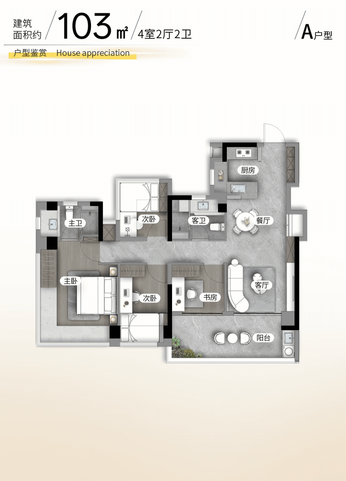 103㎡的4房2厅2卫,设计的是竖厅格局,客厅3.5米开间,LDKB一体化,S墙设计预留冰箱卡槽位,四开间朝南,动静分区,主卧270°无柱转角飘窗,分别做到了主卧18.63㎡/次卧10㎡/次卧8.48㎡/次卧7㎡(包含墙体飘窗),U型厨房,卫生间干湿分离,超100%得房率(包含赠送),客厅连接次卧出6.15米长的大阳台,东南或西南朝向。