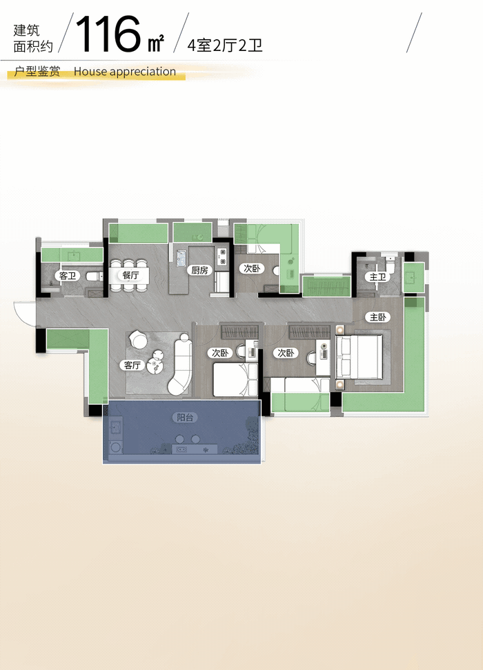 116㎡的4房2厅2卫,设计的是竖厅南北通透格局,客餐厅分离设计,四开间朝南,主卧270°无柱转角飘窗,分别做到了主卧18.3㎡/次卧11.55㎡/次卧11.16㎡/次卧8.99㎡(包含墙体飘窗),U型厨房,卫生间干湿分离,超100%得房率(包含赠送),客厅连接次卧出6.45米长的大阳台,东南朝向。