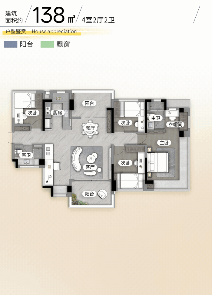 137㎡的4房2厅2卫,设计的是横厅南北通透格局,客餐厅分离设计,双阳台,四开间朝南,主卧270°无柱转角飘窗,约29㎡奢阔套房,超16米巨幕面宽,百变X空间可以改5房,U型厨房,卫生间干湿分离,超100%得房率(包含赠送),客厅阳台3.9米长,东南朝向。