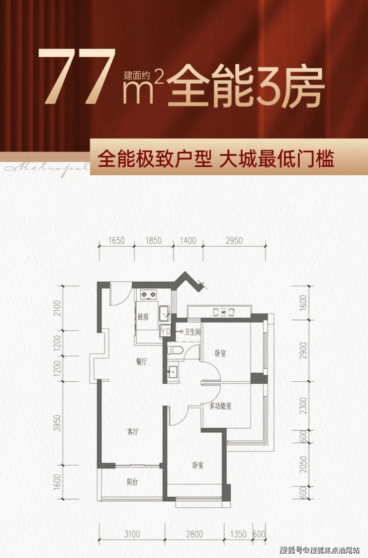 90㎡的3房2厅2卫,是横厅南北通透格局,客餐厅5.9米开间,四开间朝南,3个卧室分别做到了主卧12.95㎡/次卧8.75㎡/次卧7.75㎡(包含墙体飘窗),得房率约77%(不含赠送),阳台主朝东北或西北向