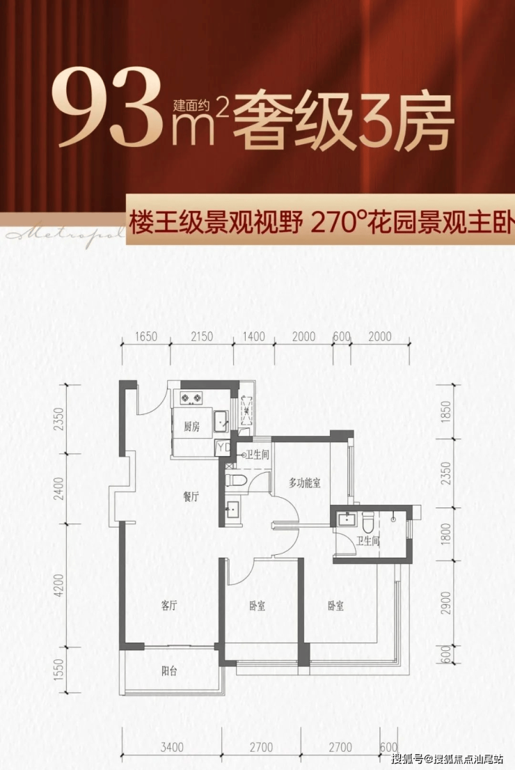 93㎡的3房2厅2卫,设计的是竖厅格局,客厅3.4米开间,3个卧室分别做到了主卧13.55㎡/次卧9.45㎡/次卧7.67㎡(包含墙体飘窗),得房率约77%(不含赠送),东南朝向。