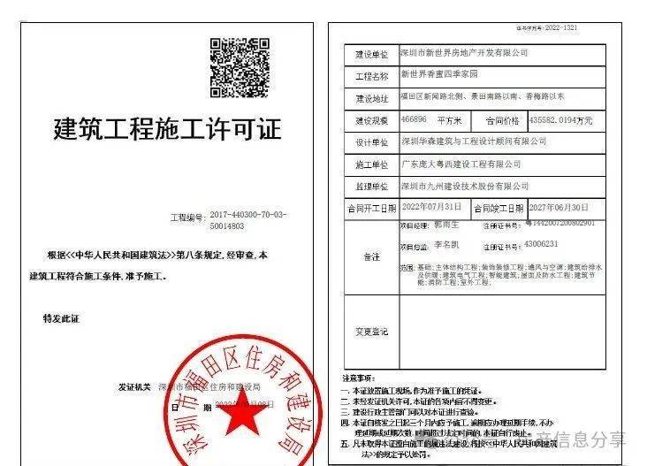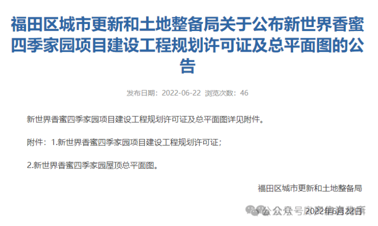 2022年6月22日,福田区城市更新和土地整备局发布关于公布新世界香蜜四季家园项目建设工程规划许可证及总平面图的公告。