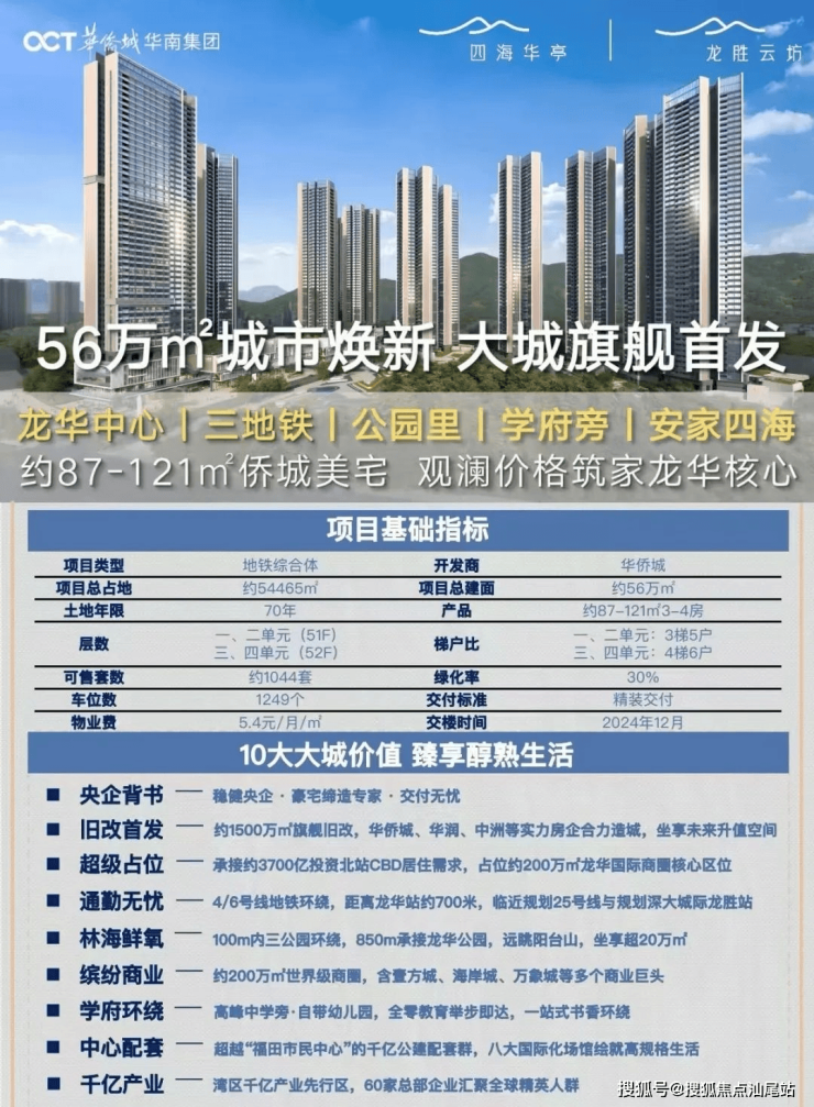 华侨城四海华亭是华侨城集团在深圳龙华区大浪街道开发的大型城市更新项目,前身为“龙胜村旧改单元”,总占地面积约5.45万㎡,总建筑面积约56万㎡,涵盖住宅、公寓、商业、教育等复合业态,定位为“生态大城综合体”。